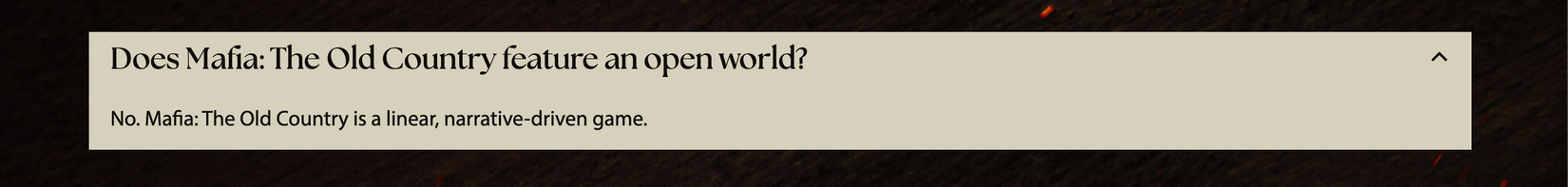 หลังจากที่มีการเปิดเผยข้อมูลสำคัญของเกม Mafia: The Old Country ในงาน PAX East ที่ผ่านมา ซึ่งรวมถึงการประกาศวันวางจำหน่ายในวันที่ 8 สิงหาคม 2025 การกำหนดราคาที่เข้าถึงง่ายที่ 1,390 บาท และการเผยตัวอย่างรูปแบบการเล่นใหม่ที่แสดงให้เห็นถึงการขี่ม้า การลอบเร้น และการยิงปืน ล่าสุด สตูดิโอ Hangar 13 ผู้พัฒนาเกม ได้ออกมายืนยันข้อมูลสำคัญอีกประการหนึ่งคือ เกมนี้จะ "ไม่ใช่" ประสบการณ์การเล่นในรูปแบบโลกเปิด (Open-world) ซึ่งเป็นการยืนยันข้อมูลที่เคยมีการกล่าวถึงเป็นนัยมาก่อนหน้านี้ตั้งแต่เดือนธันวาคมปีที่แล้ว