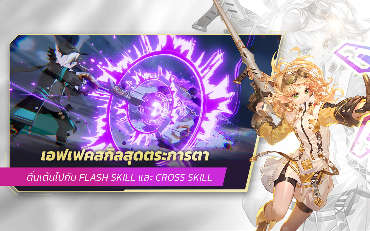 - ระบบสกิลโจมตี: เอฟเฟคสกิลสุดตระการตาด้วยรูปแบบการโจมตีผ่านสกิล 2 แบบ Flash สกิล และ Cross สกิล ที่ช่วยเพิ่มพลังจากโจมตีในรูปแบบ combo ร่วมกับตัวละครภายในเกม
