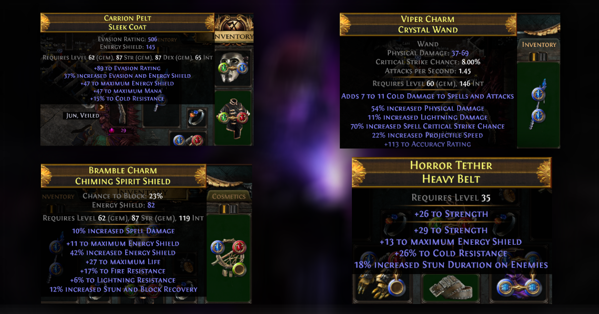 อัปเดต POE 3.27 มาพร้อม Gem ใหม่ในตระกูล Kinetic ชื่อ Kinetic Rain ซึ่งสำหรับครั้งนี้เราจะตามรอย POE player อย่าง Peuget2 ไปกับสายฝนแห่งความตายกับ Gem Skill Kinetic Rain กับ Class Witch ที่เลื่อนเป็น Elementalist โดยชุดต่าง ๆ จะเน้นหนักไปที่การป้องกันประเภท Evasion Rating กับ Energy Shield ใช้อาวุธเป็น Wand คู่กับ Spirit Shield เพิ่มเติมด้วยเข็มขัด Heavy Belt สุดท้ายก็รองเท้าที่เน้น Movement Speed ตามปกติ โดย Build นี้จะเริ่มเล่นได้จริงในช่วงเริ่มวิ่ง Map เพราะงั้นระหว่างวิ่ง Act จะใช้ Gem อื่น ๆ ไปก่อน
