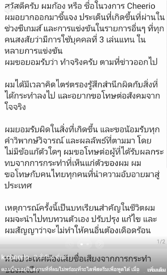 จากประเด็นร้อนวงการอีสปอร์ตไทยล่าสุดเปิดการเคลื่อนไหวแล้ว เมื่อมีผู้ใช้รายหนึ่งที่ใช้ชื่อบน Tiktok ว่า "ก้อง Cheerio" โพสต์ข้อความเพื่อชี้แจงและยอมรับผิดเกี่ยวกับข้อกล่าวหาเรื่องการให้บุคคลที่ 3 ลงแข่งขันแทนอย่างเป็นทางการแล้ว