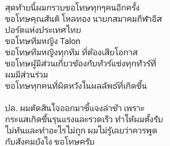 โดยเจ้าตัวได้กล่าวขอโทษไปยังผู้ที่เกี่ยวข้องทุกภาคส่วน ไม่ว่าจะเป็น คุณสันติ โหลทอง นายกสมาคมกีฬาอีสปอร์ตแห่งประเทศไทย, สังกัดทีมหญิง Talon และทีมผู้เข้าแข่งขันหญิงทีมอื่นๆ ที่ได้รับผลกระทบและเสียโอกาสจากการกระทำดังกล่าว