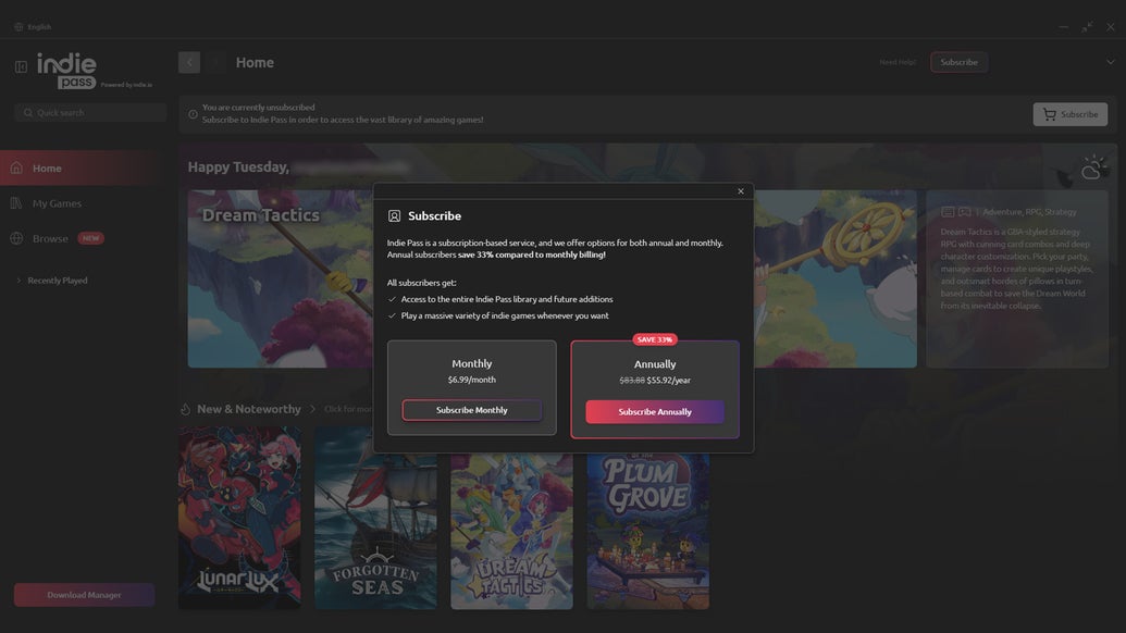 เว็บไซต์ Gamesindustry รายงานว่าค่ายผู้จัดจำหน่ายเกมอิสระ Indie.io ประกาศเตรียมเปิดให้บริการระบบสมัครสมาชิกรายเดือนรูปแบบใหม่ในชื่อ Indie Pass ซึ่งจะเปิดให้ใช้งานอย่างเป็นทางการในวันที่ 13 เมษายนนี้ ในราคา 6.99 ดอลลาร์สหรัฐต่อเดือน โดยในช่วงเริ่มต้นจะมีคลังเกมให้เลือกเล่นประมาณ 70 เกม ซึ่งครอบคลุมทั้งผลงานจากทางค่ายเองอย่าง Echoes of the Plum Grove และซีรีส์ Dark Deity ไปจนถึงผลงานจากนักพัฒนาภายนอกที่กำลังทยอยเข้ามาร่วมแพลตฟอร์ม