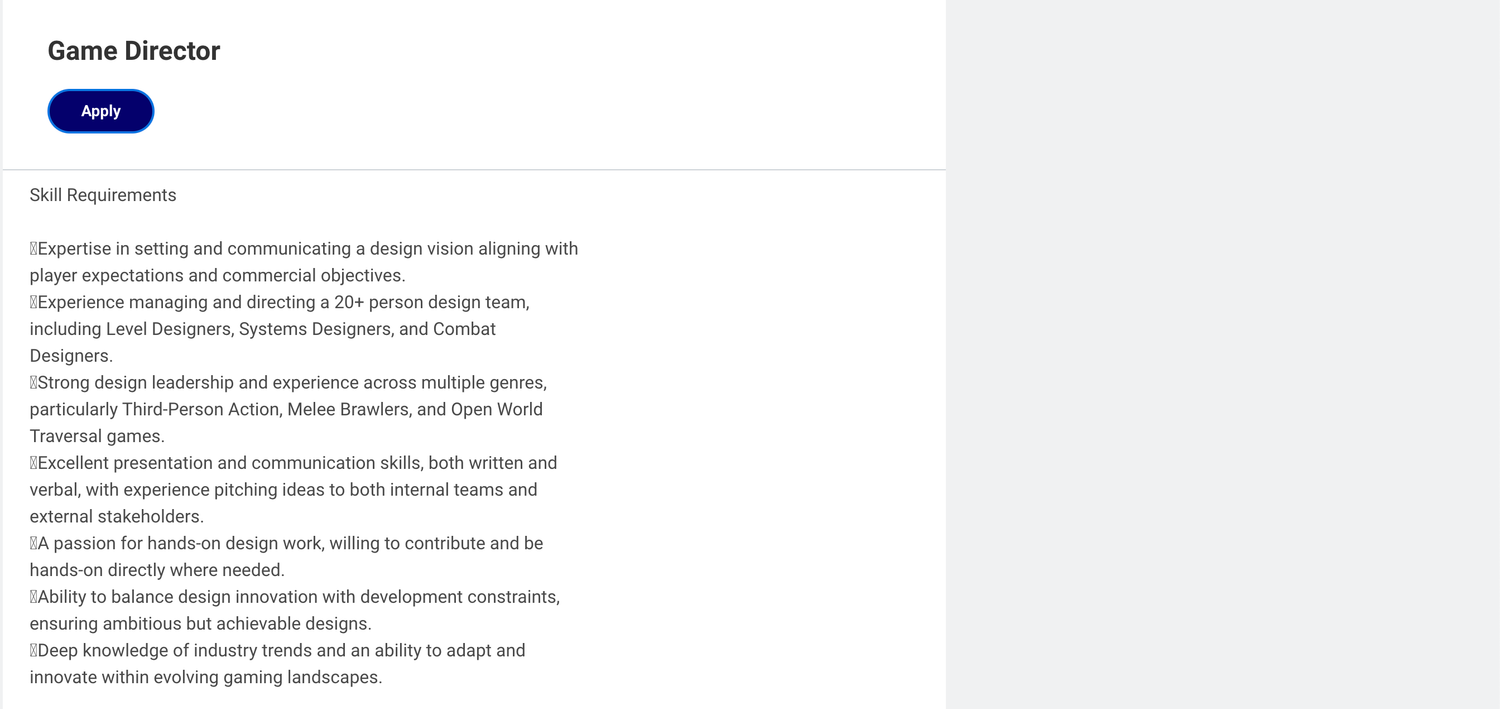 คุณสมบัติที่ Rocksteady เน้นเป็นพิเศษ คือ ประสบการณ์ในการเป็นผู้นำทีมออกแบบ และประสบการณ์ในเกมหลากหลายประเภท โดยเฉพาะเกม Third-Person Action, Melee (เกมต่อสู้ระยะประชิด) และ Open World (โลกเปิด)