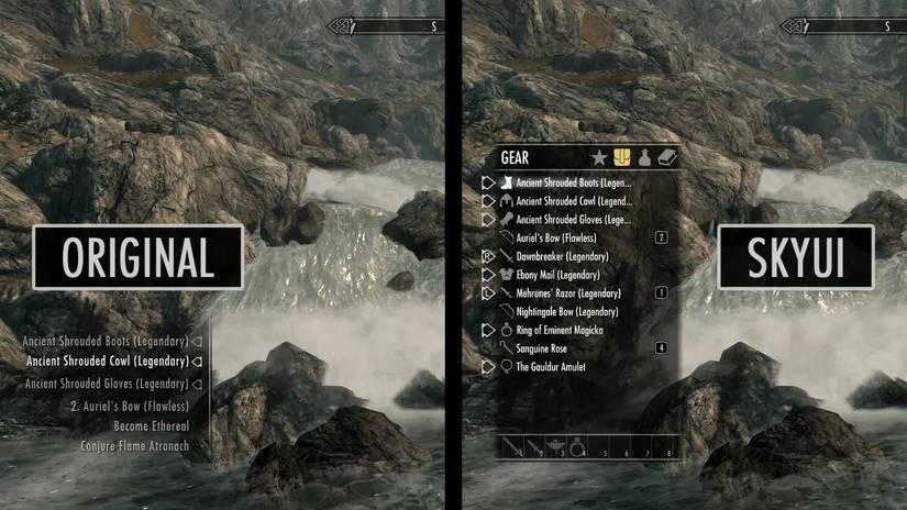 เมื่อเจาะลึกลงไปที่หน้าเพจของ Skyrim เวอร์ชั่น Original บน Nexus Mods จะพบว่า Mod ยอดนิยมส่วนใหญ่เป็น Mod ที่ช่วยปรับปรุงตัวเกมให้ทันสมัยและเล่นได้สะดวกขึ้น ตัวอย่างเช่น SkyUI Mod ที่ได้รับความนิยมสูงสุด ด้วยยอดดาวน์โหลดกว่า 25 ล้านครั้ง SkyUI ช่วยปรับปรุง User Interface (UI) ของเกมให้ใช้งานง่ายขึ้นอย่างมาก ผู้เล่นสามารถค้นหาไอเท็มด้วยการพิมพ์ข้อความ จัดหมวดหมู่ไอเท็มโปรด และจัดการช่องเก็บของได้อย่างมีประสิทธิภาพมากขึ้น